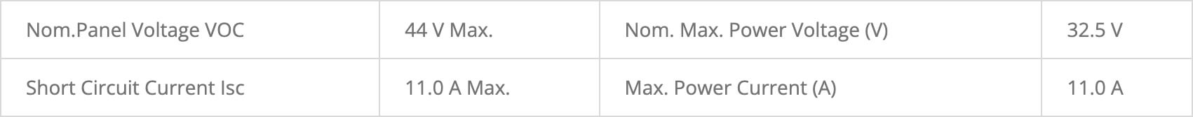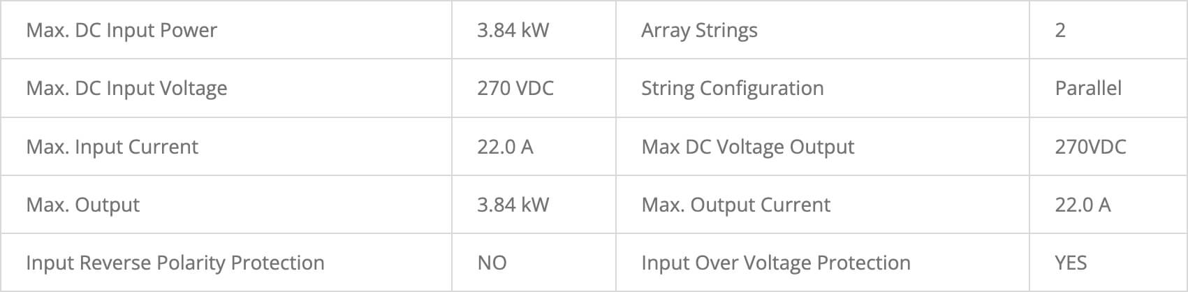 Het maximale vermogen mag niet worden overschreden. 3.84kW kan 270V @14.2A of 174V @22.0A zijn of daar tussenin. P=IR (Volts x Current), 3840W mag niet wordeen overschreden