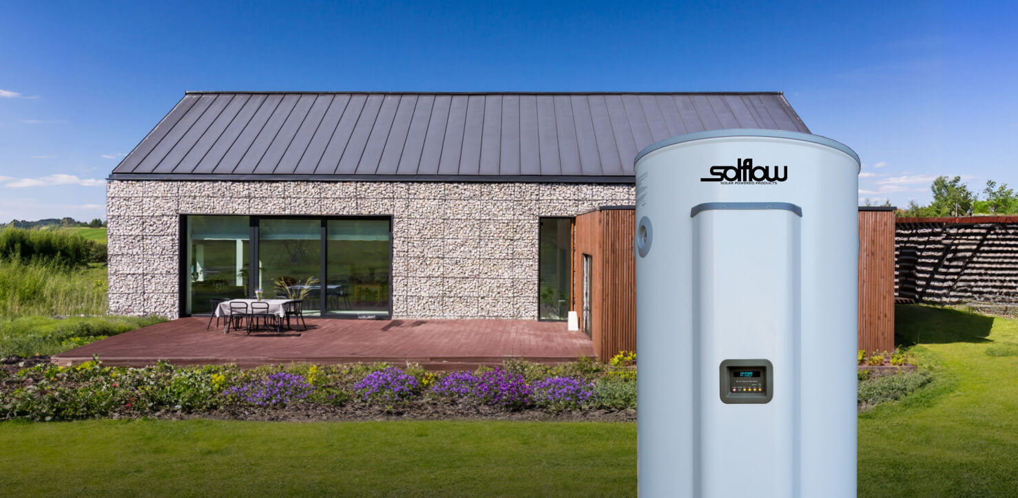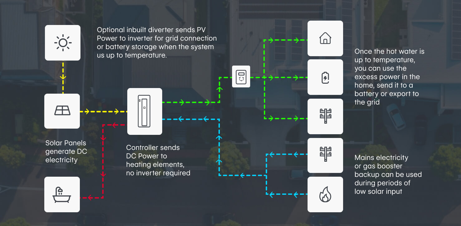 De stroom die wordt gecreëerd door de fotovoltaïsche array wordt rechtstreeks benut door de Solflow warmwater controller om water in het buffervat te verwarmen.